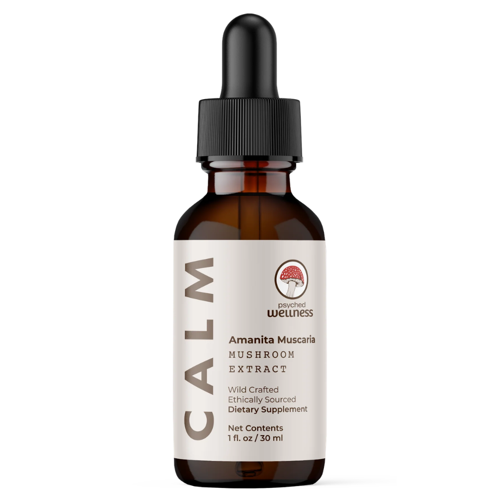 Calm is Psyched Wellness’s flagship Amanita muscaria liquid extract — a 50ml tincture for daily micro-serving use. Produced through a patented natural decarboxylation process isolating muscimol while reducing ibotenic acid to trace levels. The result is a predictable extract delivering relaxation and sleep support without harsh effects.